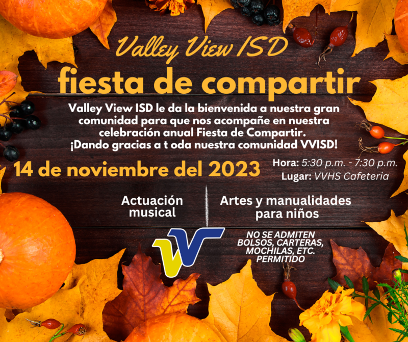 Acompáñenos a nuestra Fiesta Anual de Compartir el 14 de noviembre de 2023, de 5:30 a 7:30 p.m. No se admitirán bolsos, carteras, mochilas, etc ¡Esperamos verte ahí!