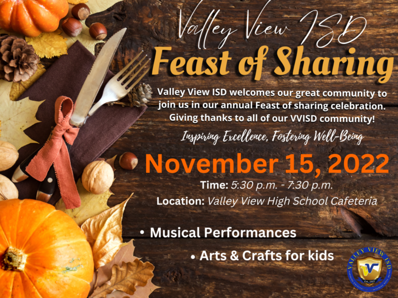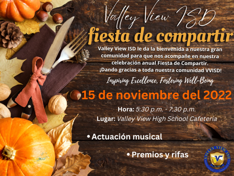 Valley View ISD welcomes our great community to join us in our annual Feast of sharing celebration. November 15, 2022, 5:30 p.m. - 7:30 p.m. at Valley View High School Cafeteria. Valley View ISD le da la bienvenida a nuestra gran comunidad para que se una a nosotros en nuestra celebración anual Fiesta de compartir. 15 de noviembre de 2022, 5:30 p.m. - 7:30 pm. en la cafetería de la escuela preparatoria Valley View.